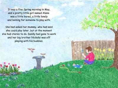 Mummy All the kids on the street barge into the backyard where little Alana is playing on her own. They have a great time all together. But this fun is short-lived, for they leave as quickly as they came. Alana, who is too young to play in the front, is left alone in the yard with no one to play with. Until…..! Children love the colorful drawings and the music and narration that accompanies this book. The medium is colored pencil. The book and CD come in a smart package (as pictured here) that houses and protects both of them together. Below you will find the first six pages. 18 Pages Ages 3-7 Book size closed:5" x 7 ISBN 0-9687142-2-6 $15.95 US Price includes shipping |